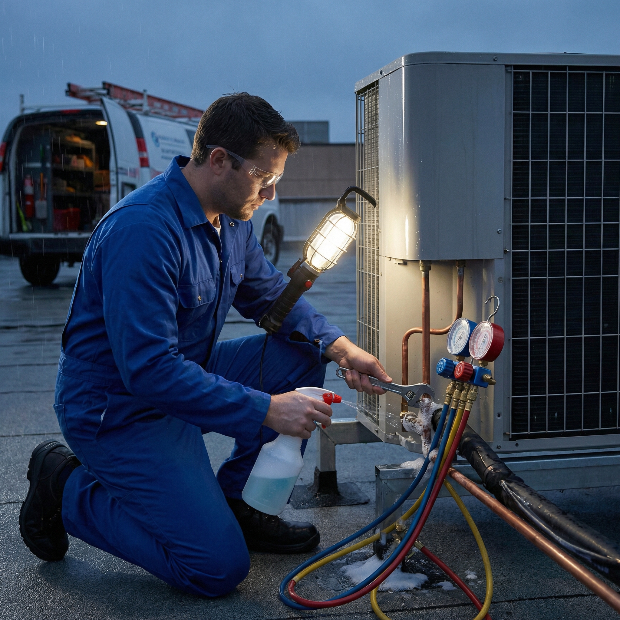 - Test ciśnienia i szczelności układu chłodniczego